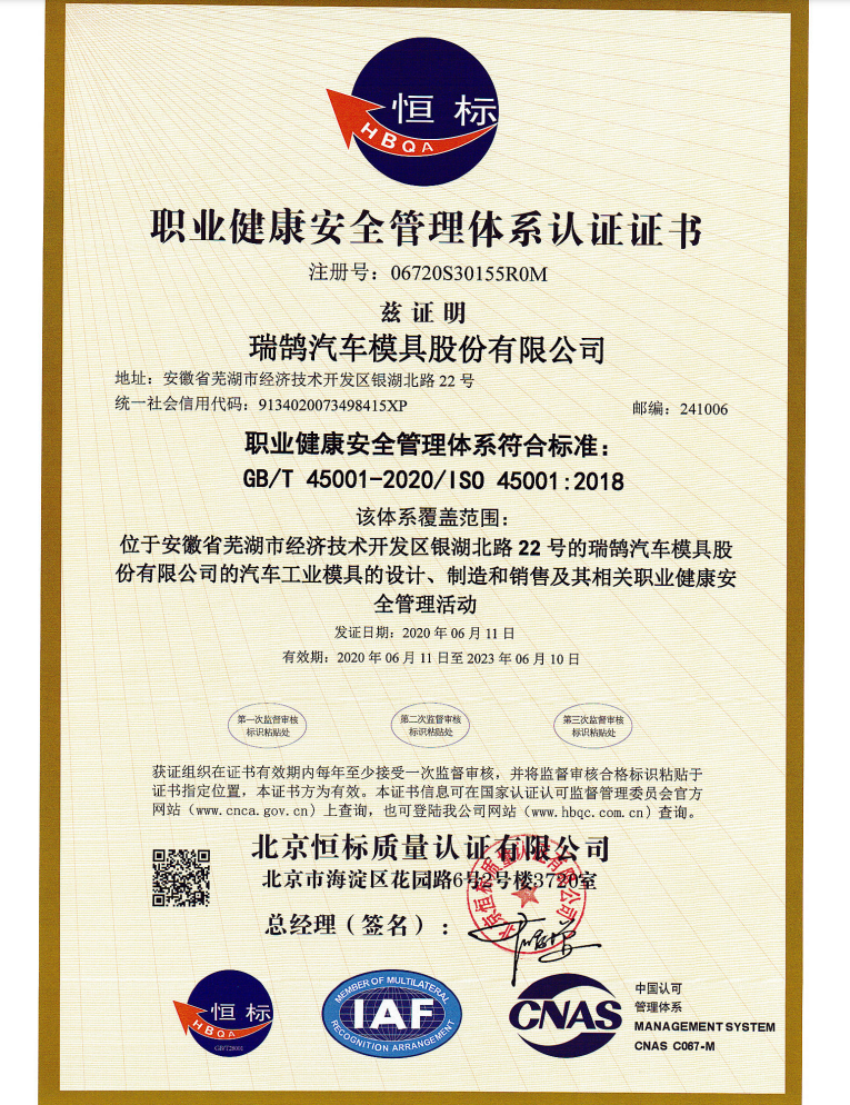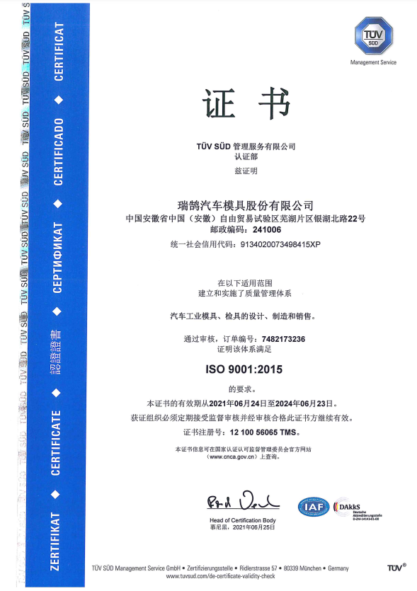 ????????瑞鵠汽車模具股份有限公司成立于2002年3月,坐落于中國(安徽)自由貿易試驗區蕪湖片區銀湖北路 22 號,股本數18360萬,公司的主營業務為汽車沖壓模具、檢具及焊裝自動化生產線的開發、設計、制造和銷售,主要產品有沖壓模具(覆蓋件模具、高強板模具)及檢具、焊裝自動化生產線、一體化鋁壓鑄零部件,為國內少數能夠同時為客戶提供完整的汽車白車身高端制造裝備、智能制造技術及整體解決方案的企業之一。